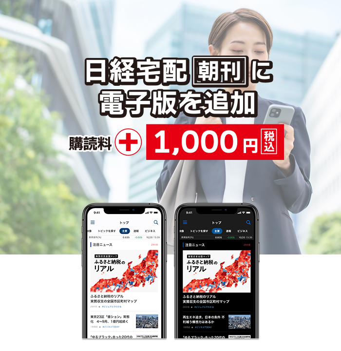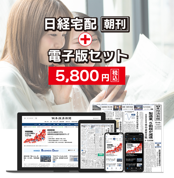 日本経済新聞宅配と電子版をセットでご利用いただけるプランです。月ぎめ料金は宅配4,800円に電子版追加料金プラス1,000円の、5,800円(税込)でご利用いただけます。