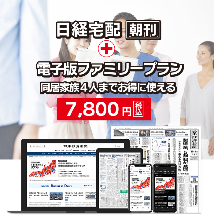 同居されているご家族4人様までが登録できるファミリープランです。日本経済新聞月ぎめ宅配料金4,800円に電子版ファミリープラン追加料金プラス3,000円の、7,800円(税込)でご利用いただけます。